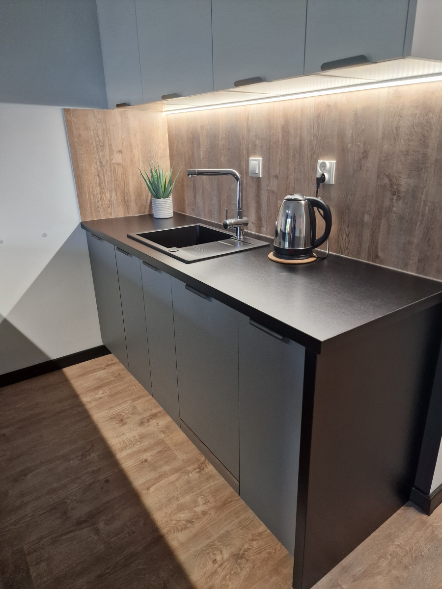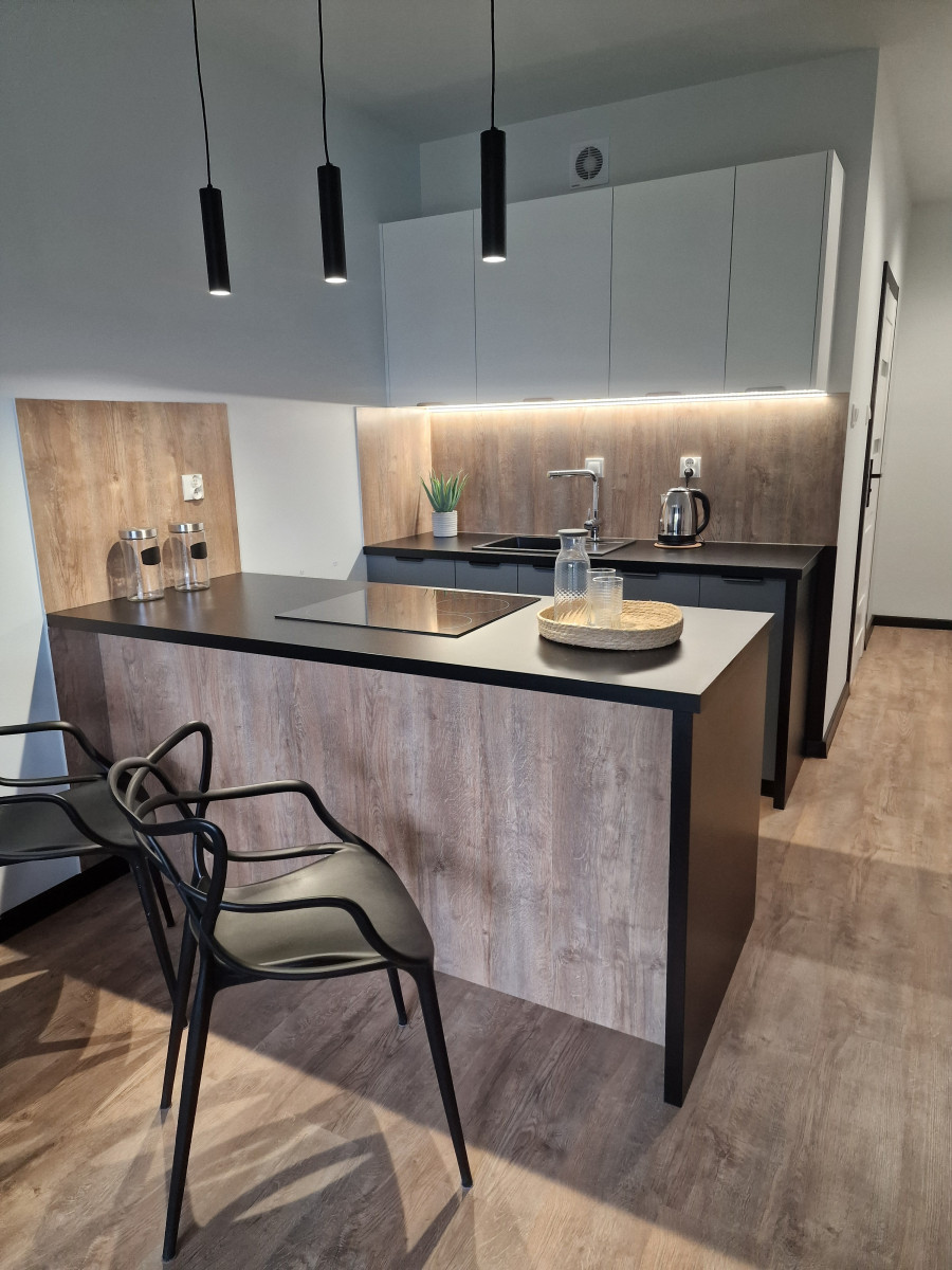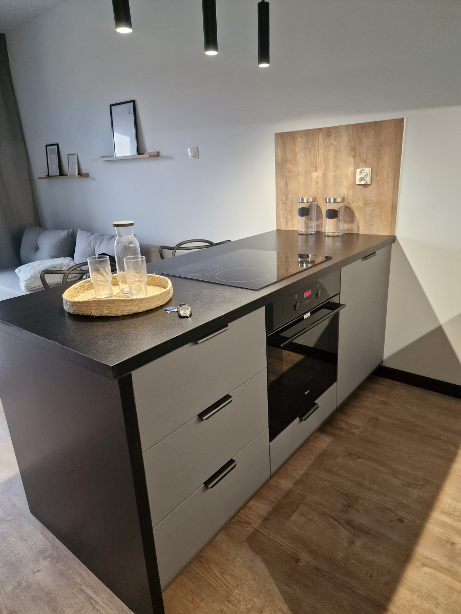 Aneks kuchenny, który jest nowocześnie wyposażony, zapewniając pełen komfort użytkowania. Zainstalowana zmywarka ułatwia codzienne obowiązki, a lodówka pozwala na wygodne przechowywanie żywności. Kuchenka indukcyjna zapewnia szybkie i bezpieczne gotowanie, a piekarnik umożliwia przygotowanie różnorodnych dań. Wszystkie sprzęty są ergonomicznie rozmieszczone, co sprawia, że kuchnia jest funkcjonalna i praktyczna, idealna do codziennego gotowania i przechowywania.