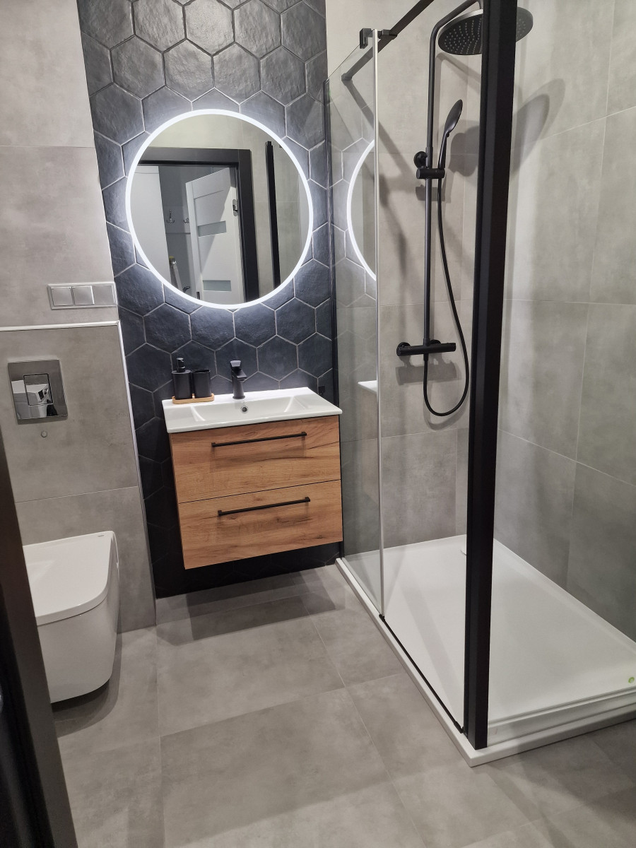 Łazienka jest nowocześnie urządzona i funkcjonalna. Prysznic z przeszklonymi drzwiami zapewnia komfort podczas codziennego użytkowania. Umywalka osadzona na praktycznej szafce oferuje dodatkowe miejsce do przechowywania kosmetyków i akcesoriów łazienkowych. Duże, podświetlane lustro nad umywalką nie tylko dodaje elegancji, ale także optycznie powiększa przestrzeń, jednocześnie zapewniając doskonałe oświetlenie do codziennych zabiegów pielęgnacyjnych. Jasne płytki na ścianach i podłodze wprowadzają do wnętrza świeżość i nowoczesny charakter.