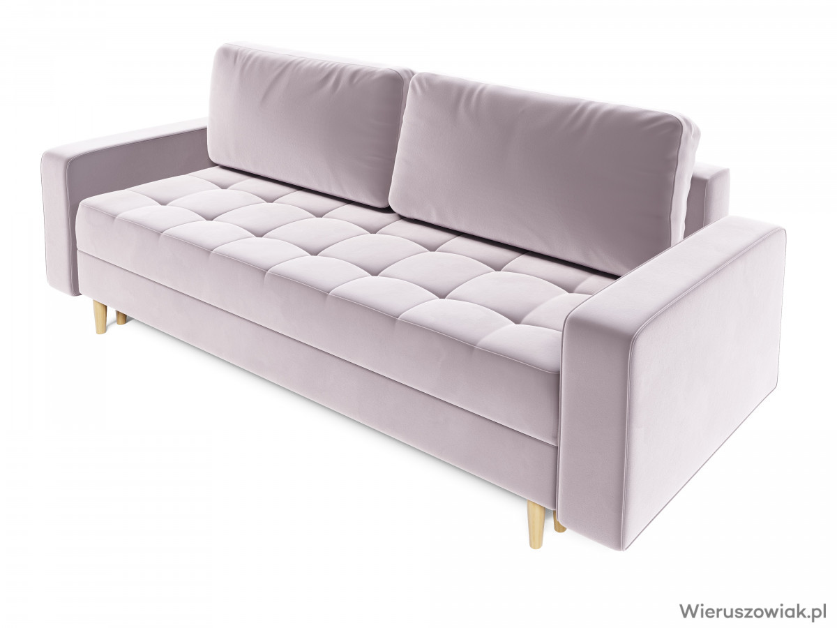 Sofa opiera się na solidnych, drewnianych stożkowych nóżkach, które nie tylko dodają jej nowoczesnego charakteru, ale także zapewniają stabilność. Tkaniny użyte do jej produkcji łączą estetykę z łatwością w pielęgnacji, gwarantując trwałość oraz komfort użytkowania.