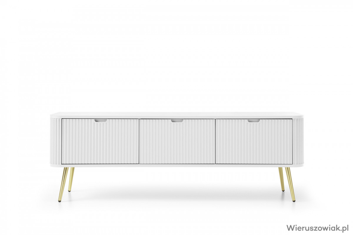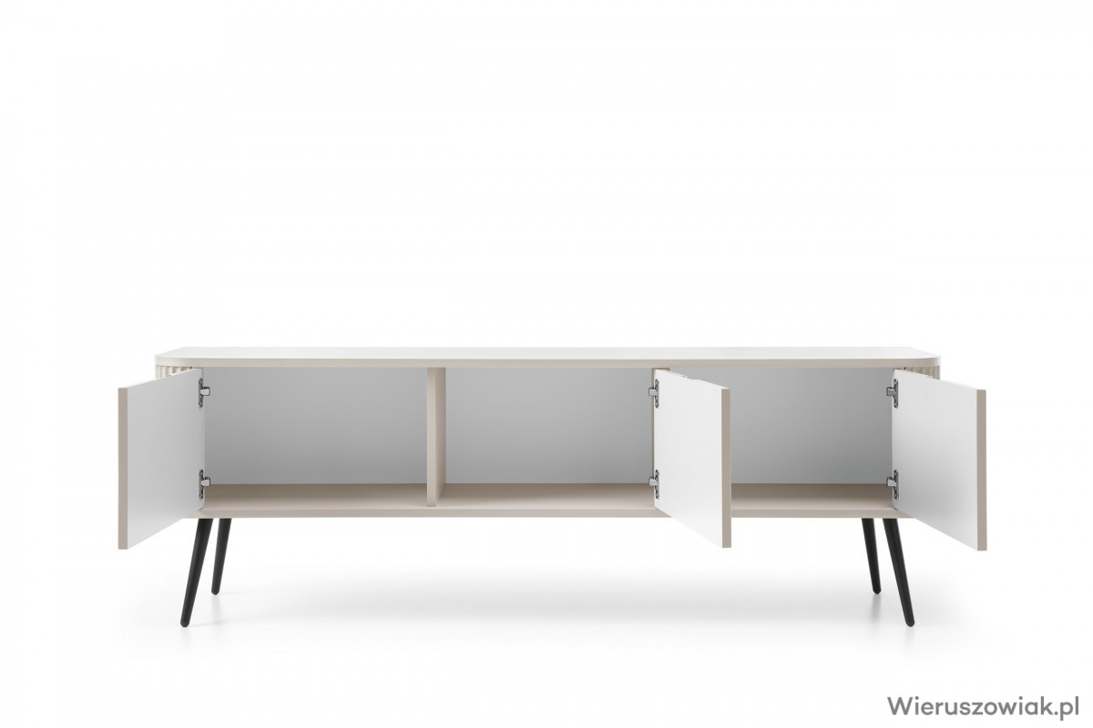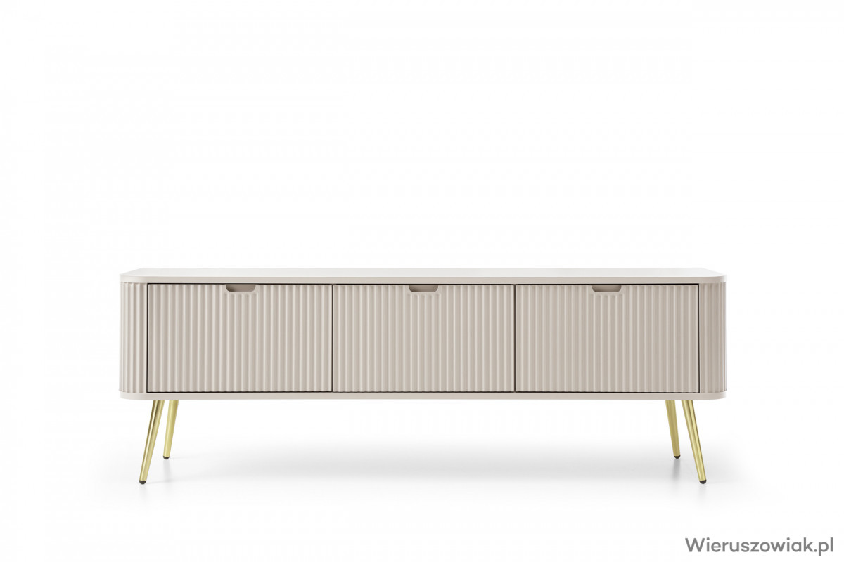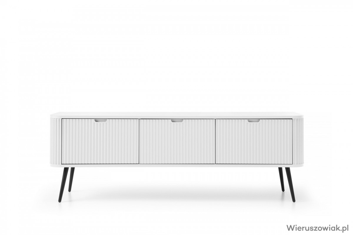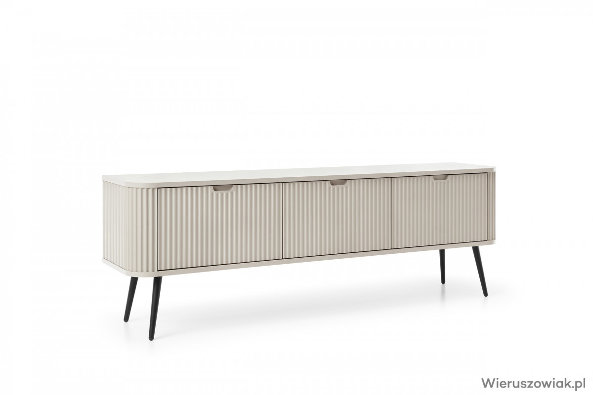 Szafka RTV Elara to wyjątkowy element wyposażenia salonu, który doskonale łączy nowoczesny design z praktycznością. Jej fronty zdobi delikatne ryflowanie, które nadaje całości subtelnego charakteru. Owalny kształt korpusu sprawia, że szafka jest nie tylko estetyczna, ale również doskonale komponuje się z różnymi aranżacjami wnętrz.
