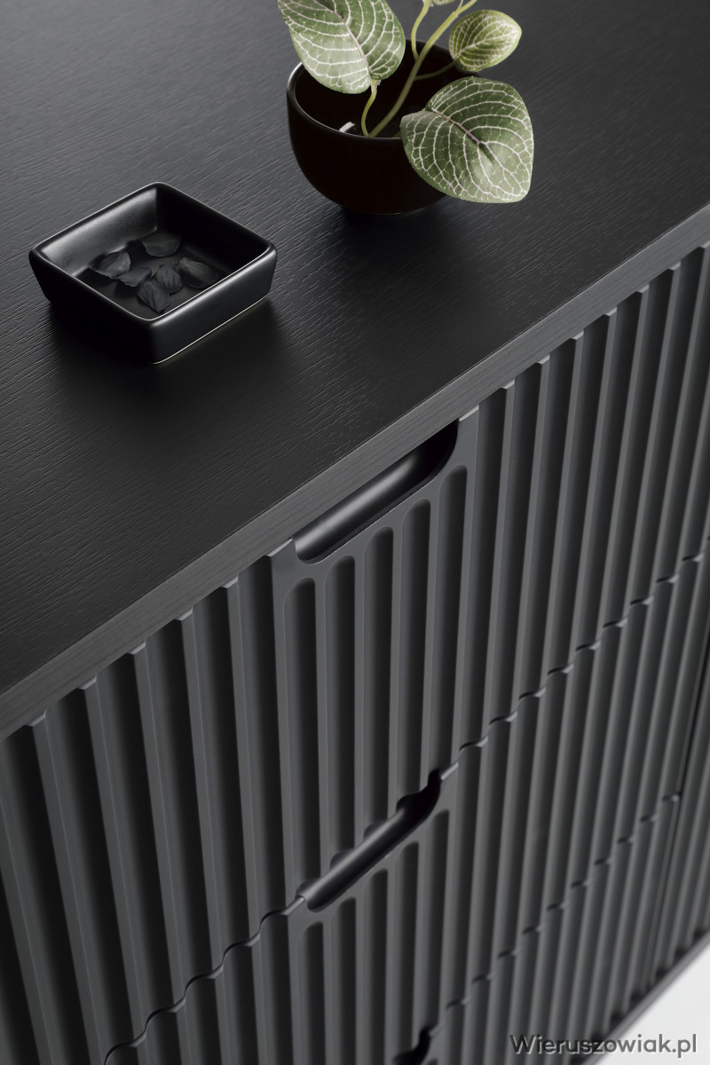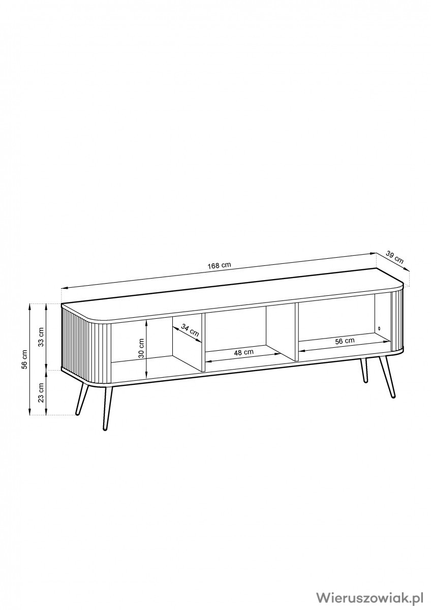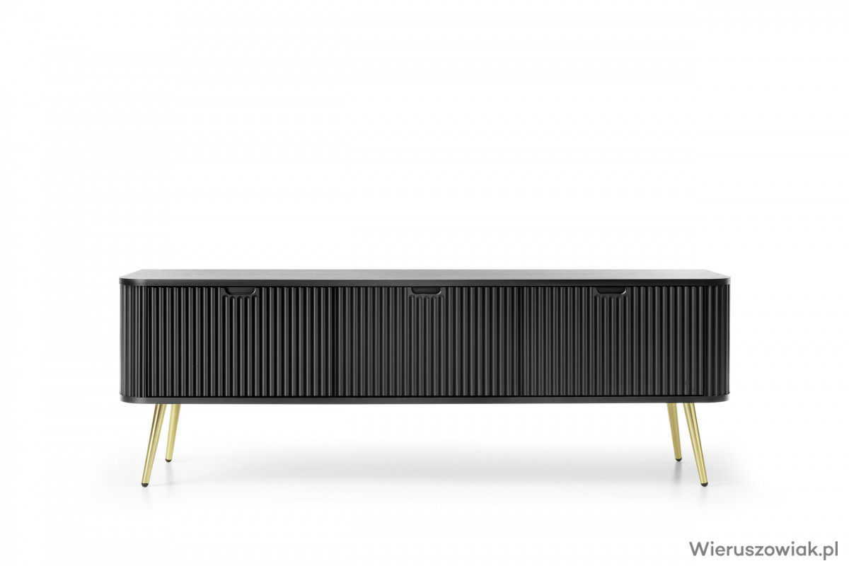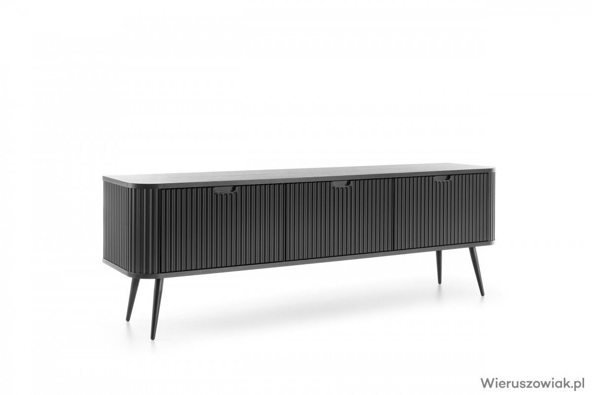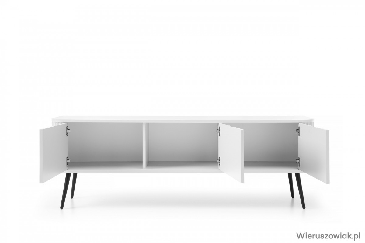 Szafka RTV Elara to wyjątkowy element wyposażenia salonu, który doskonale łączy nowoczesny design z praktycznością. Jej fronty zdobi delikatne ryflowanie, które nadaje całości subtelnego charakteru. Owalny kształt korpusu sprawia, że szafka jest nie tylko estetyczna, ale również doskonale komponuje się z różnymi aranżacjami wnętrz.