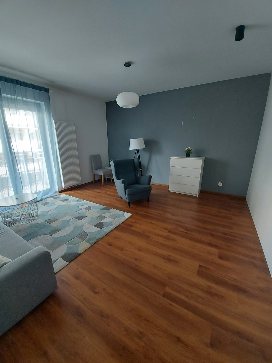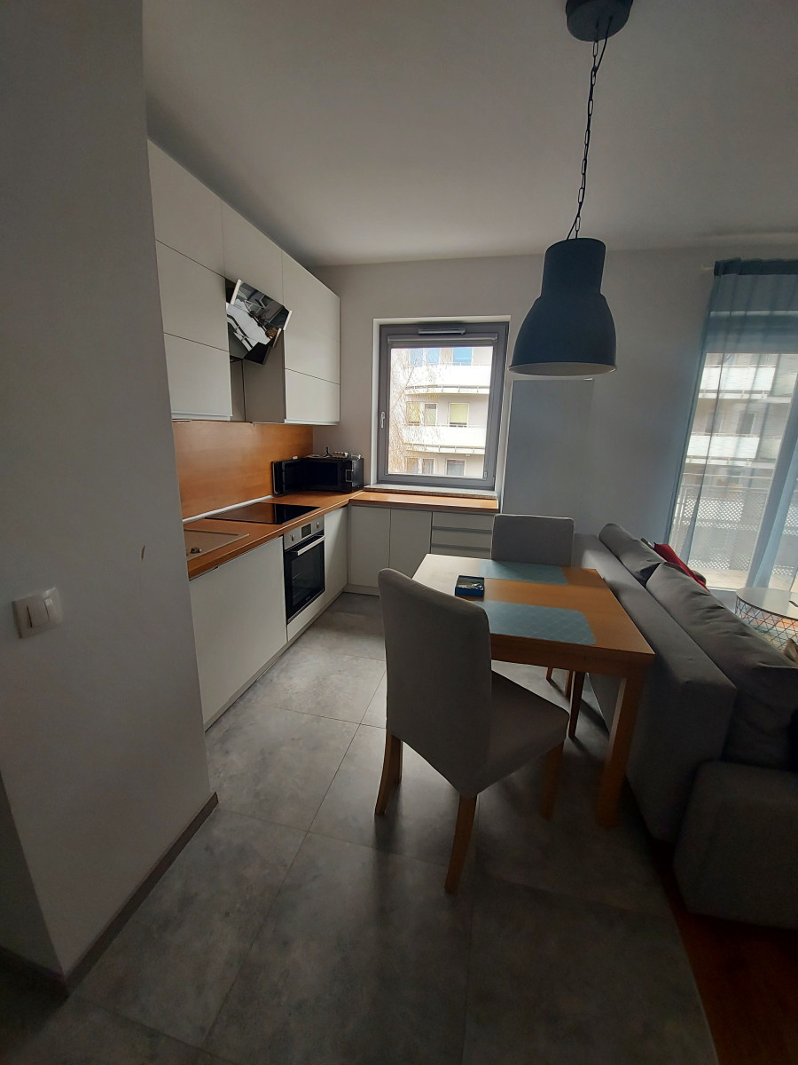 Po wejściu do mieszkania ukazuje nam się hol, z którego możemy przejść do głównego pomieszczenia w mieszkaniu, czyli jasnego salonu z aneksem kuchennym. Aneks jest wyposażony w sprzęt AGD (lodówka, kuchenka, zmywarka, okap, płyta indukcyjna) oraz posiada część jadalną ze stołem i krzesłami. W salonie zaś znajduje się wygodna kanapa, z której można oglądać TV. Z salonu możemy wyjść na duży balkon, na którym możemy miło spędzić czas w okresie letnim.
