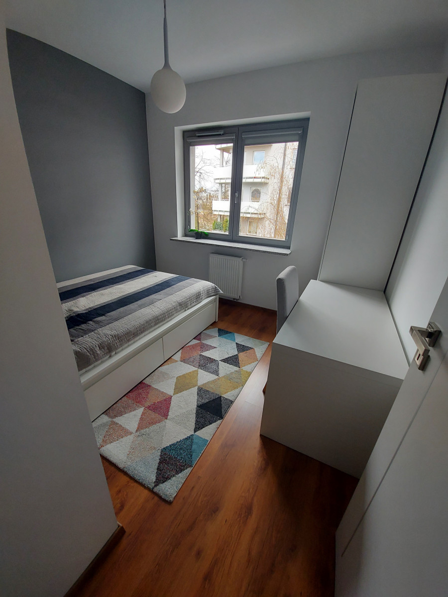 Następnie mamy kameralną sypialnię, która posiada duże łóżko oraz pojemną szafę, która pomieści pokaźną ilość ubrań. W sypialni znajduje się też komfortowa przestrzeń do pracy lub nauki.