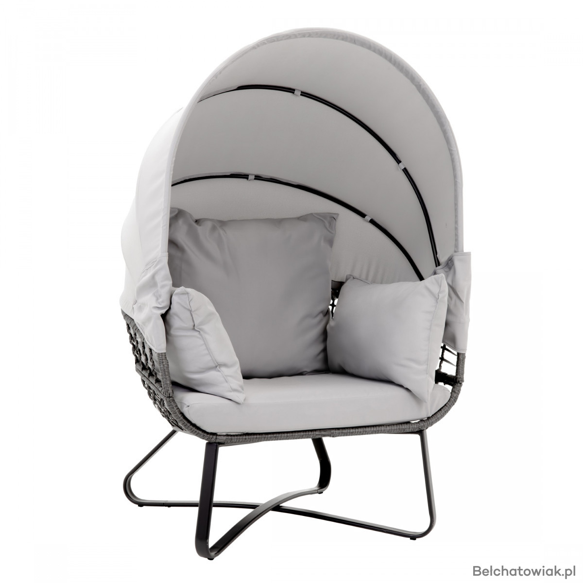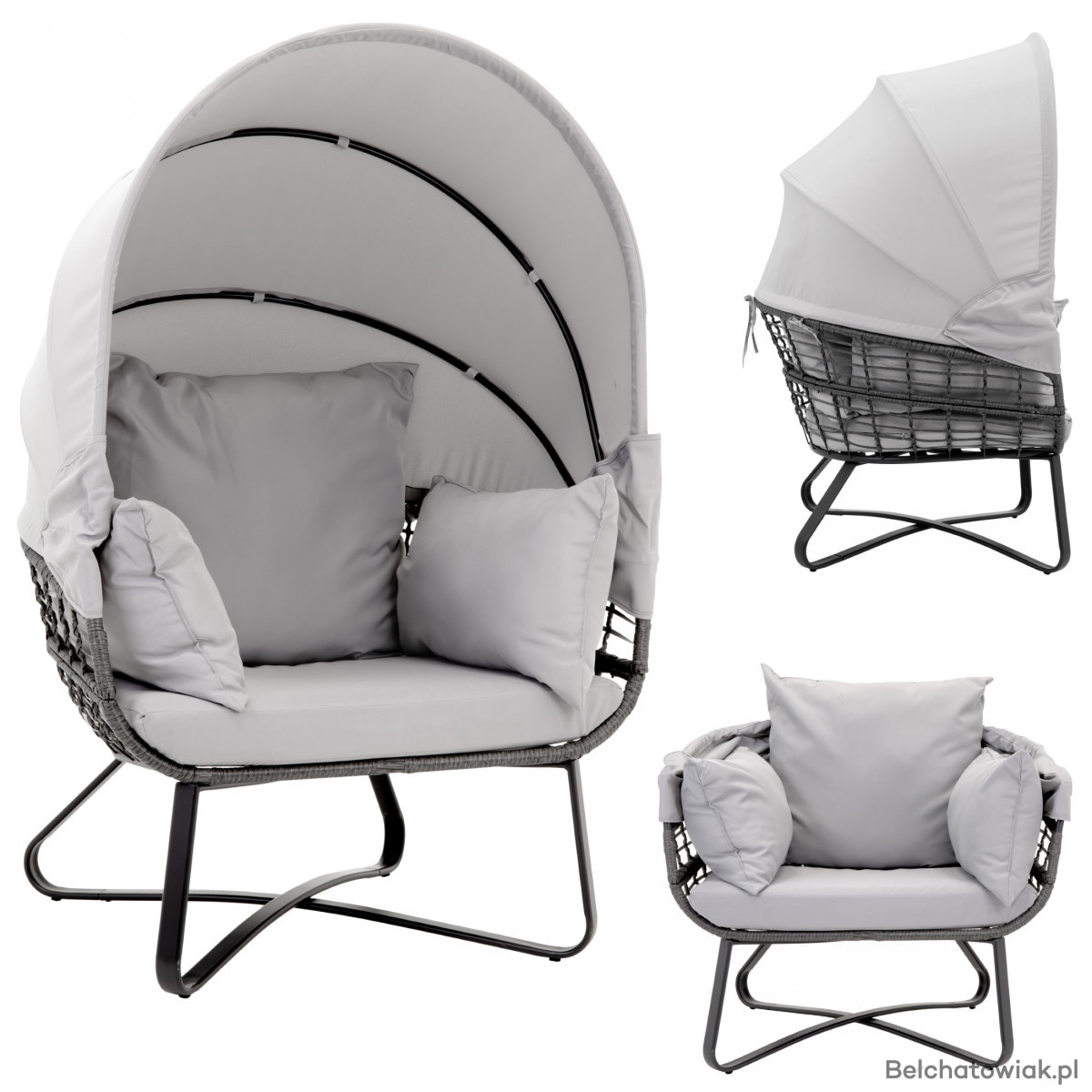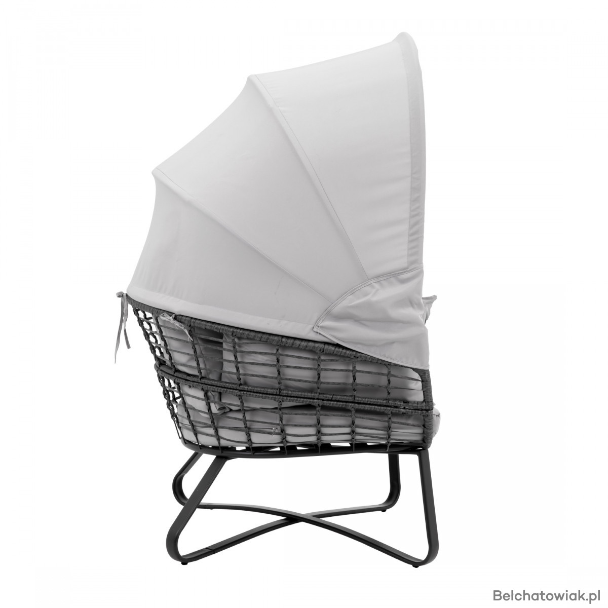Jego zabudowany, otulający design daje poczucie prywatności i ochrony, a składany daszek przeciwsłoneczny pozwala samodzielnie regulować ilość światła i cienia. Miękkie, grube poduchy zapewniają wygodę nawet podczas długich godzin odpoczynku.