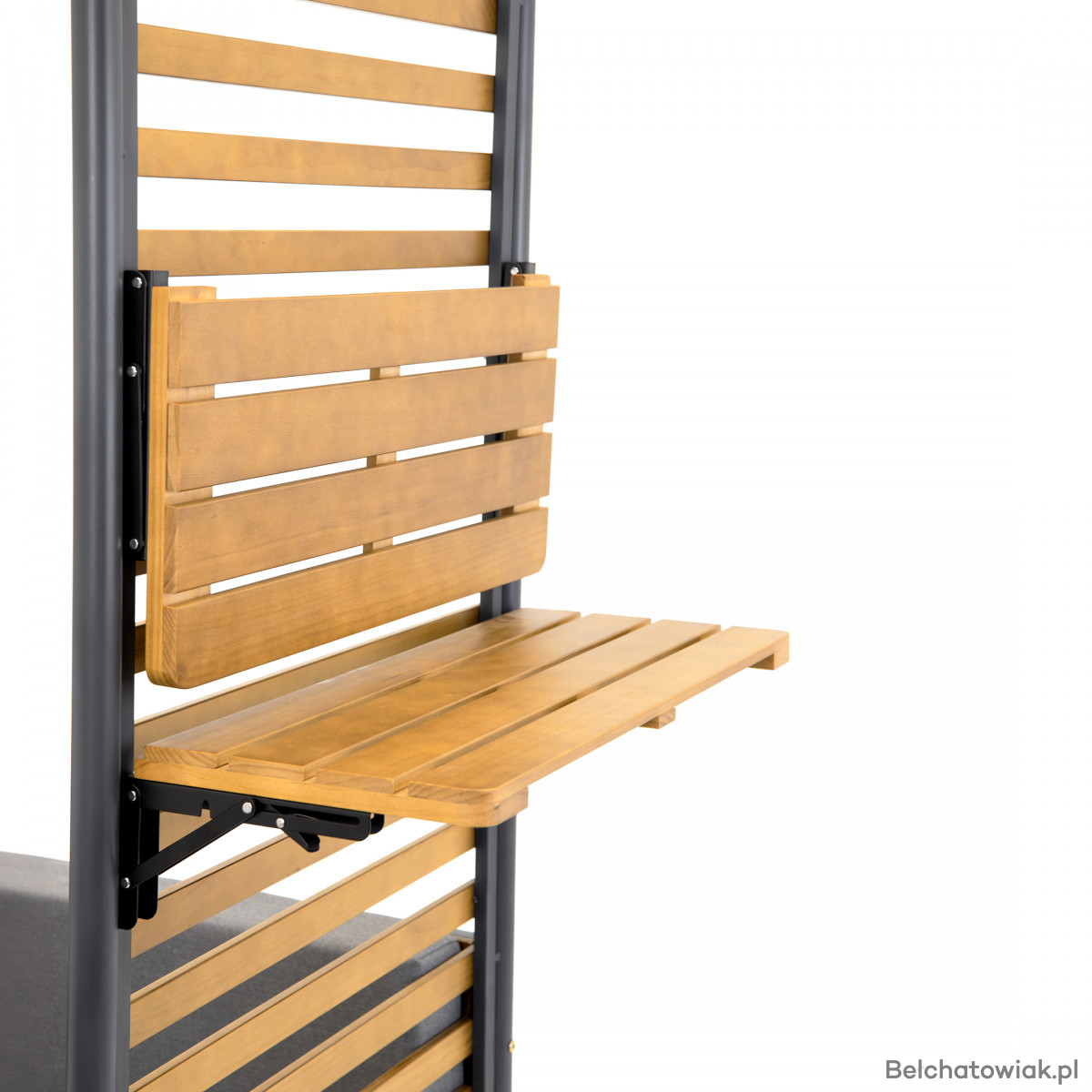 Zintegrowana ławka z wysokim oparciem zapewnia komfort siedzenia, a wkomponowane półki umożliwiają wyeksponowanie roślin, lampionów czy ulubionych dekoracji. To rozwiązanie, które łączy estetykę z praktycznością.