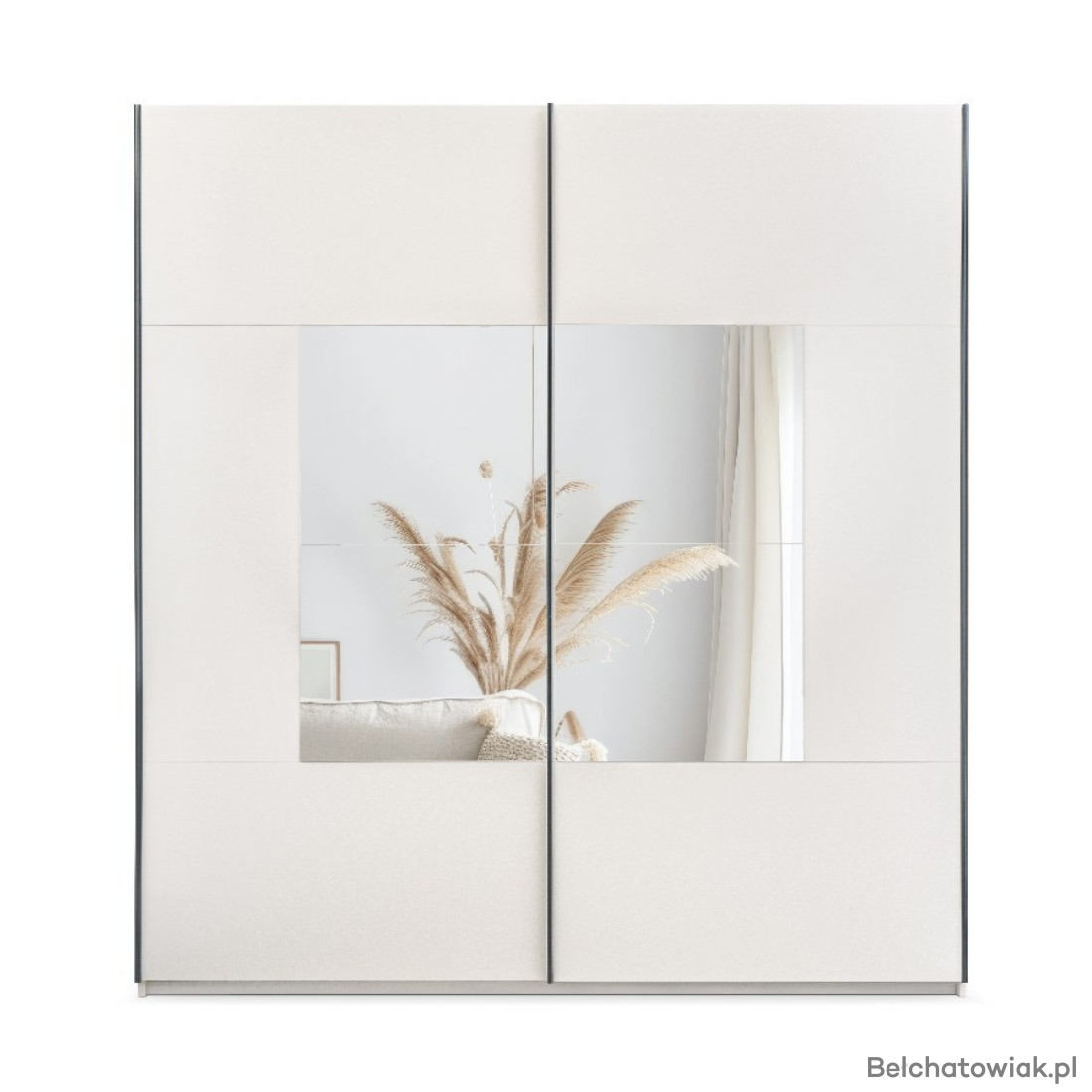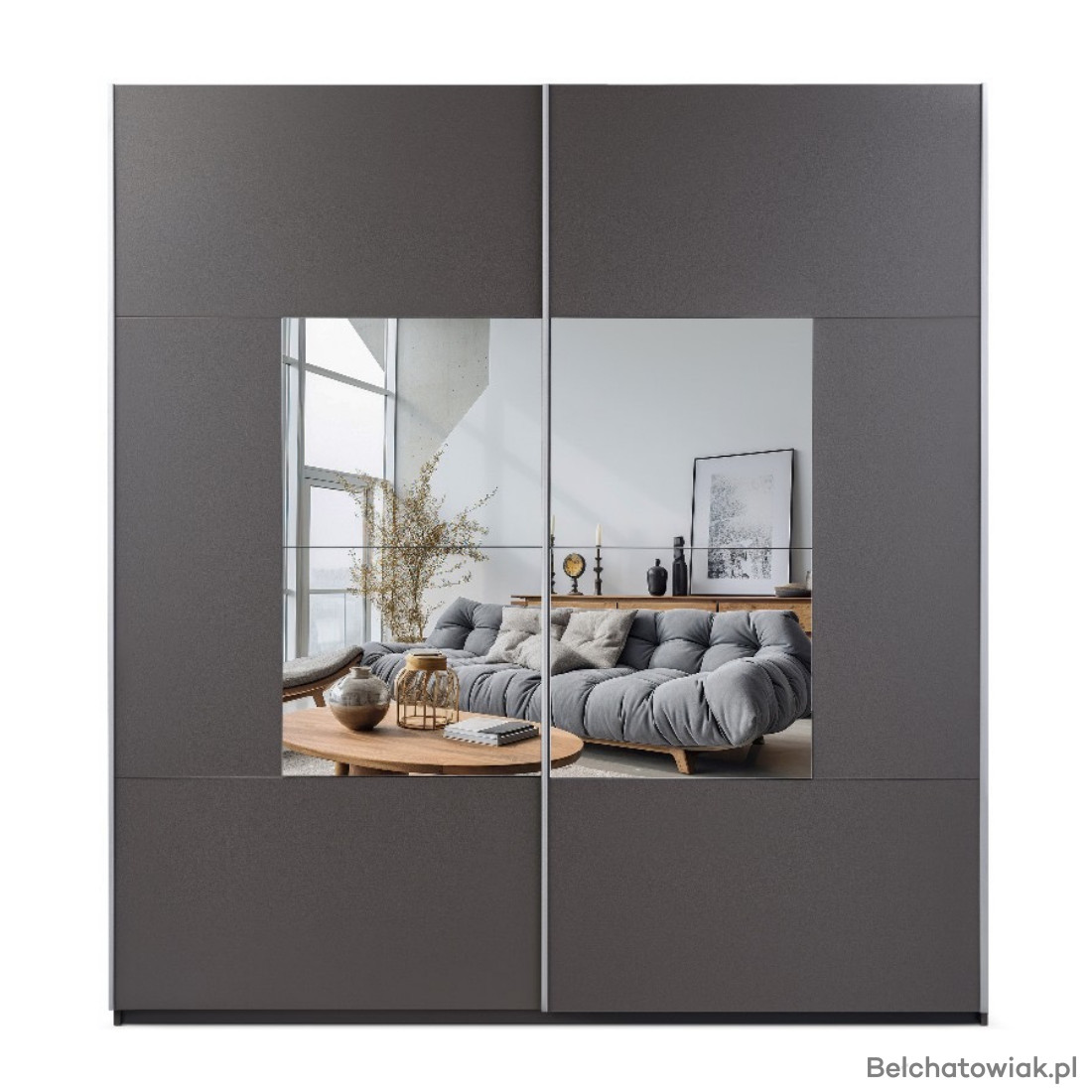 Elegancka szafa przesuwna z lustrem to idealne połączenie funkcjonalności i designu. Front w kolorze kaszmir lub grafit w zestawieniu z dużym lustrem nadaje wnętrzu wyjątkowego charakteru i optycznie powiększa przestrzeń.