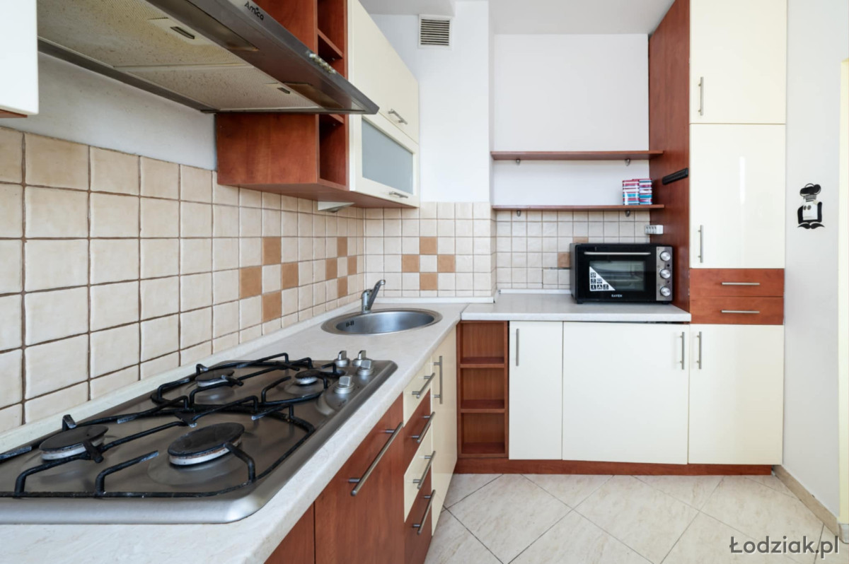Kuchnia jest zadbana, przestronna, praktyczna. Jasne fronty szafek, dwa okna, lodówka, płyta gazowa, opiekacz i pralka w zabudowie — wszystko pod ręką, by gotowanie było czystą przyjemnością. Pod ścianą dodatkowy blat służący jako stolik dla 2 osób.