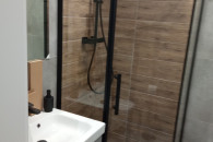 Łazienka wyposażona jest w kabinę prysznicową, umywalkę, toaletę, pralkę.
