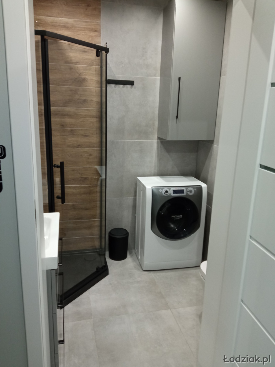 Łazienka wyposażona jest w kabinę prysznicową, umywalkę, toaletę, pralkę.