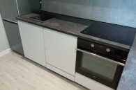 W kuchni znajdują się: lodówko-zamrażarka płyta indukcyjna, piekarnik, zmywarka, czajnik, przybory i naczynia kuchenne.