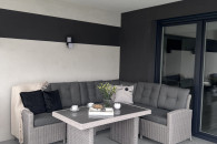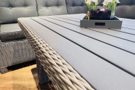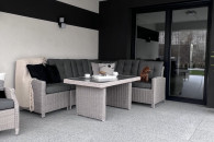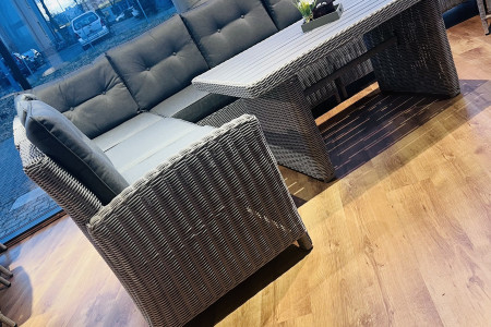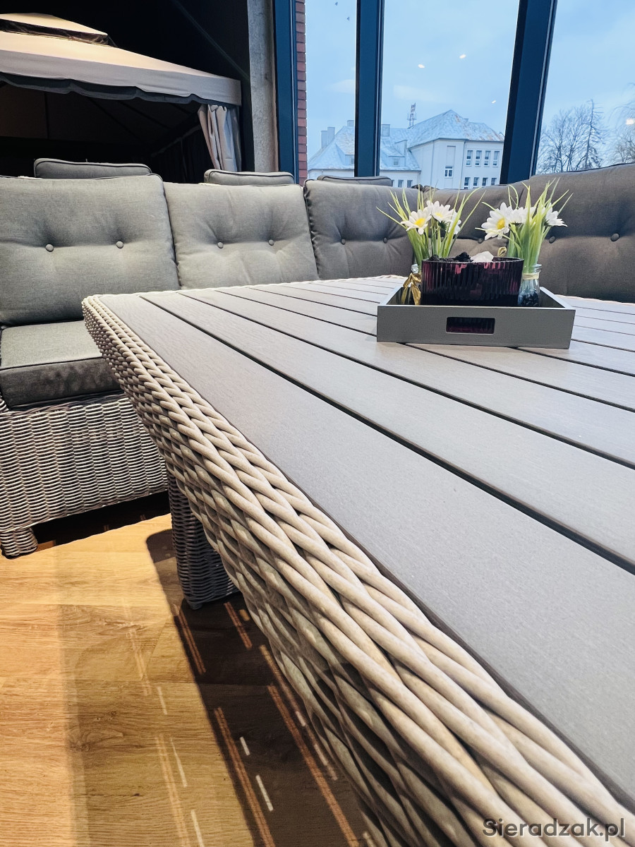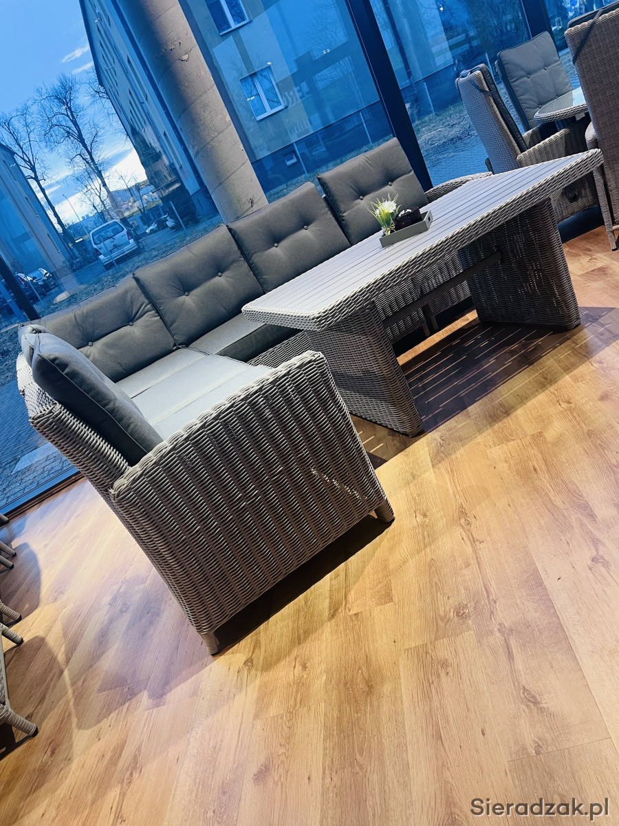 Stylowy zestaw wypoczynkowy. Wykonany z trwałego technorattanu oraz wyposażony w wygodne poduszki do siedzenia, idealnie nadaje się na duże spotkania.